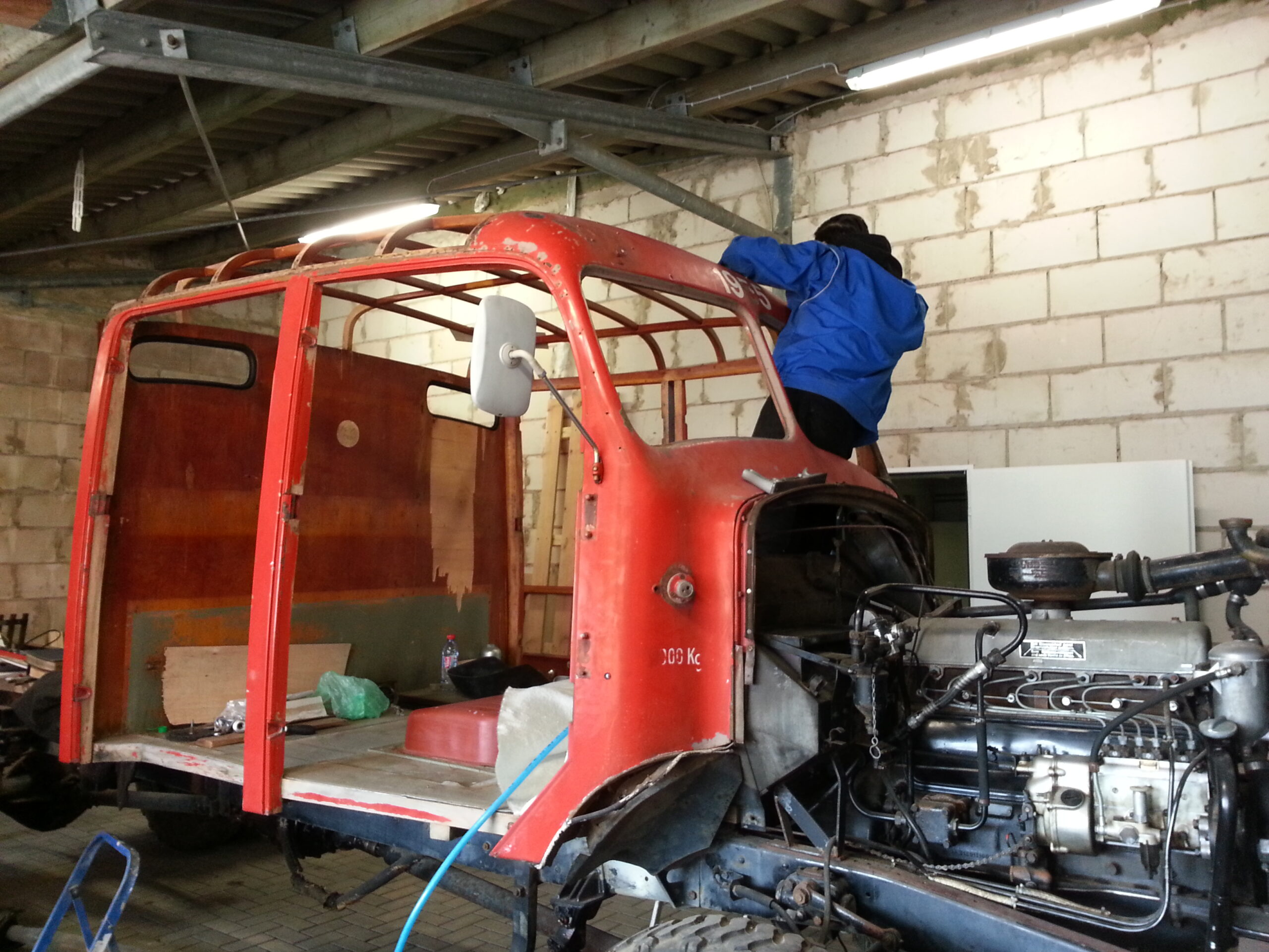 Ausführung von Schweißarbeiten an der Blechverkleidung der Mannschaftskabine. Des weiteren wurden die stark in Mitleidenschaft gezogenen Kotflügel grob gerichtet.