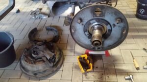 Bei Arbeitsdienst am Mittwoch wurden zur Erneuerung und Aufarbeitung der Bremsanlage sämtliche Bremsbacken, sowie Radbremszylinder und weitere Kleinteile demontiert. Nach eingehender Untersuchung zeigt sich, dass die Hinteren Radbremszylinder nicht mehr Überholt werden können. Auch die Bremsbeläge sind durch Alterung und Standschäden unbrauchbar geworden. Passender Ersatz konnte zum Glück bei den einschlägigen Oldtimer LKW Händlern geordert werden.