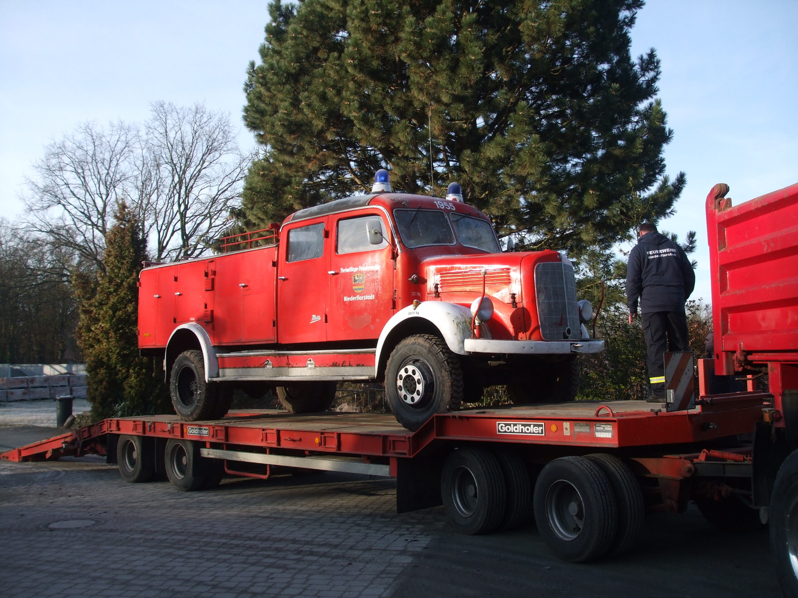 Am Freitag den 02.03.2012 um 22.00 Uhr machten sich sieben Kameraden mit einem Tieflader auf den Weg nach Berlin, mit dem Ziel das altes TLF 15, liebevoll Max genannt, wieder nach Hause zu holen. So geschah es dann auch. Um 6.00 Uhr am Samstagmorgen in Berlin angekommen, lud man ihn so gegen 8.00 Uhr auf den Tieflader der Firma Dielmann und begab sich auf den Heimweg. Zuhause angekommen staunten manch ältere Florstädter nicht schlecht, was oder besser wer da wieder auf dem Hof des Gerätehaus steht.